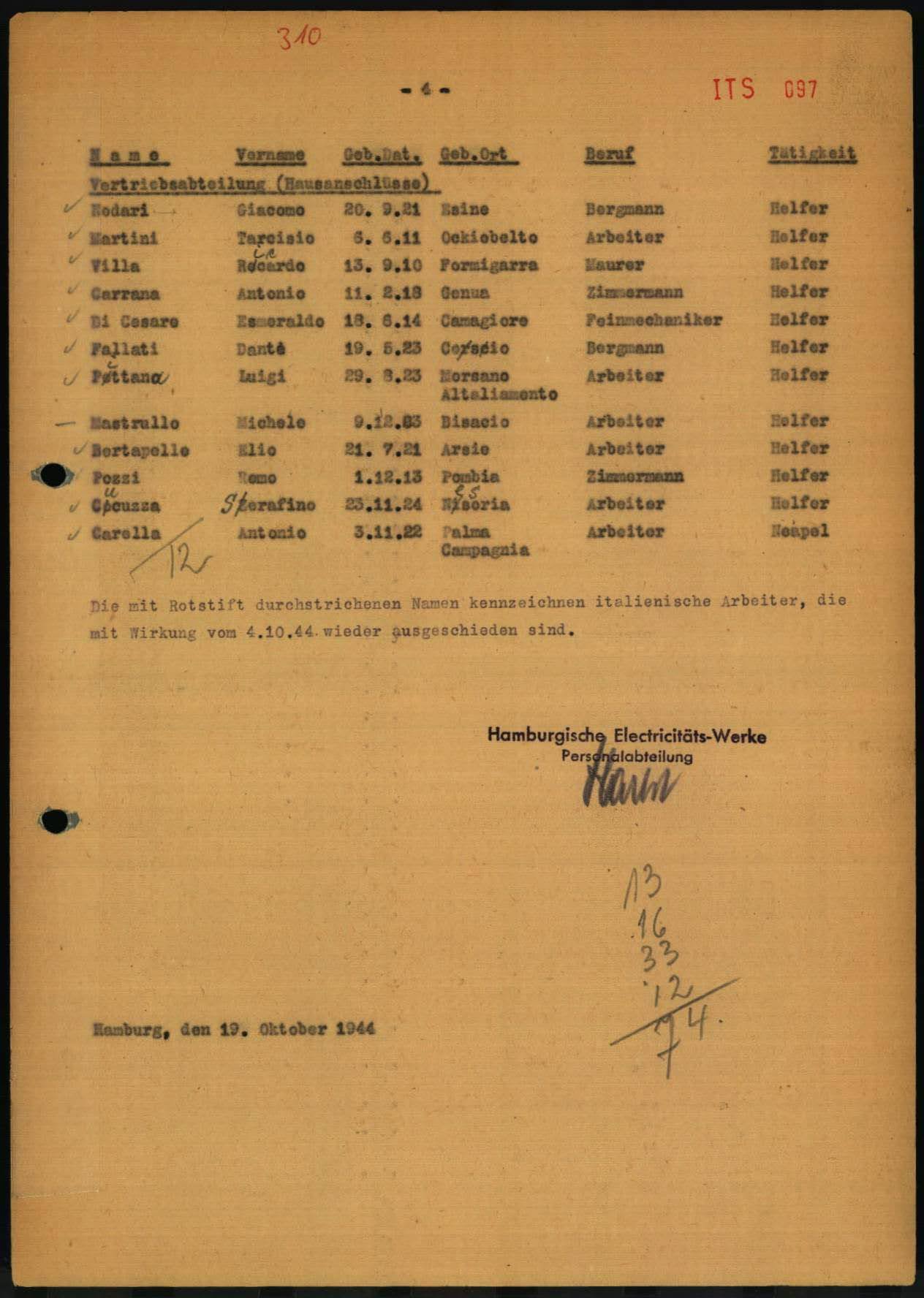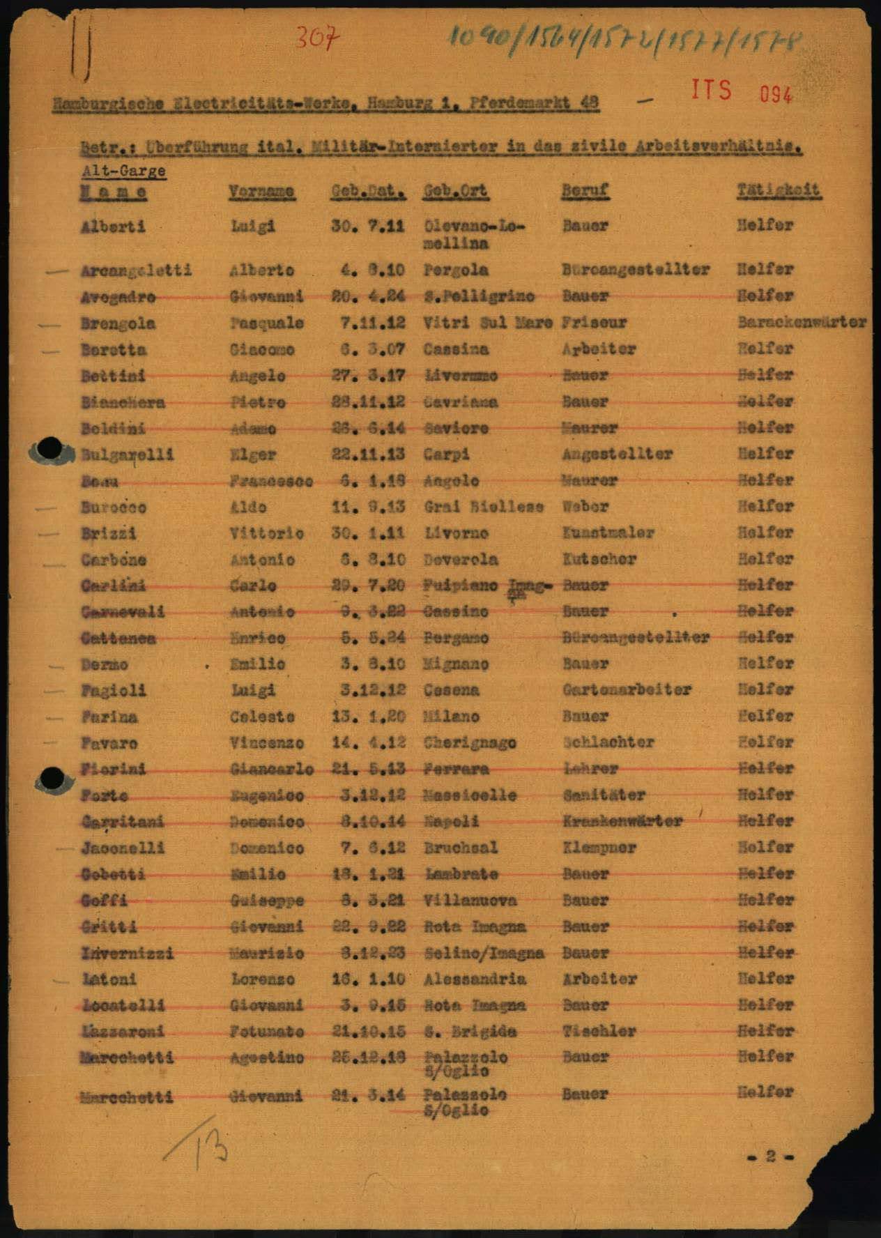 Die Hamburger Elektrizitätswerke (HEW) setzen in der NS-Zeit massenhafte Zwangsarbeiter ein. Zum 1. April 1945 waren 912 Zwangsarbeiter im Einsatz. Dazu gehörten ab September 1943 auch italienische Militärinternierten. Sie wurden vor allem in Alt-Garge, 60 km von Hamburg entfernt, eingesetzt. Weiter wurden sie auch in einem Fernheizwerk beschäftigt. Hierbei dürfte es sich vermutlich um das Werk im Hamburger Karolinenviertel gehandelt haben. Bezüglich des „Vertriebseinsatzes“, in dem die IMIs eingesetzt wurden, dürfte es sich um die Suche und die Reparatur von Stromzählern gehandelt haben. Es gibt dazu eine Anfrage an Hamburg Energie.