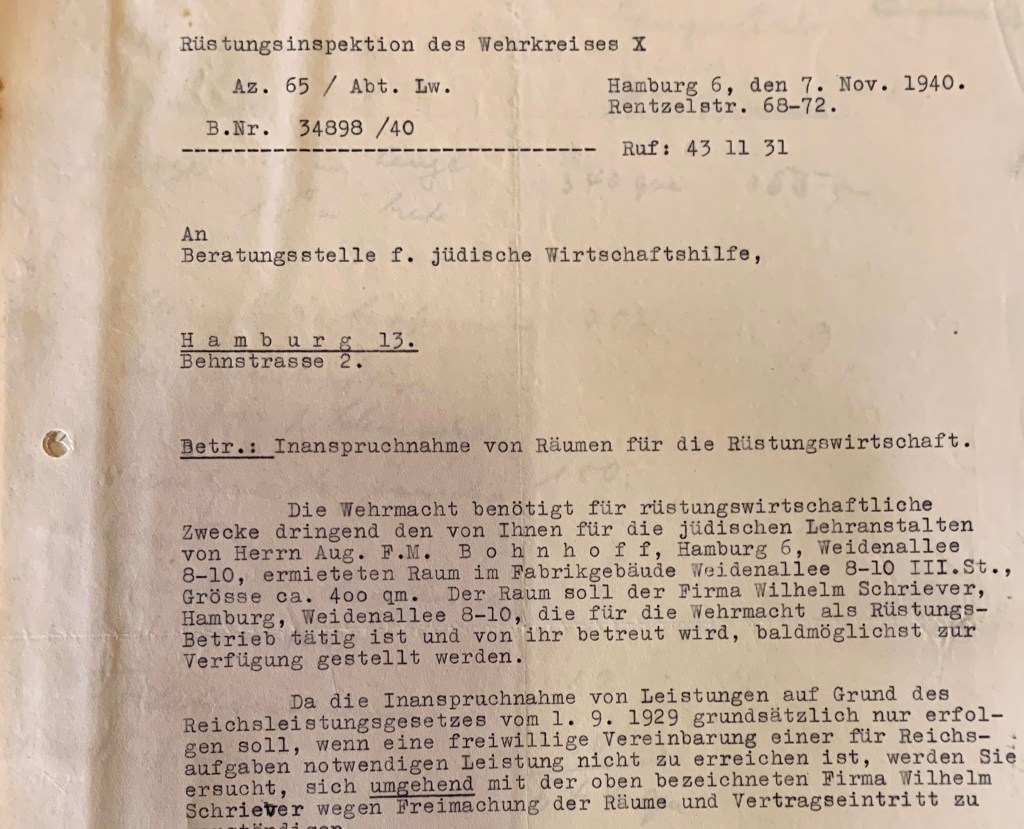 Im Gewerbehaus in der Weidenallee 10 bc waren auch zwei Unternehmen, die Zwangsarbeiter*innen für ihre Kriegsproduktion einsetzen. Eines von ihnen war das Rüstungsunternehmen von Wilhelm Schriever. Einst nur mit kleiner Produktion im 2. Stock der Weidenallee 10 bc, musste 1940/1941 die jüdische Werkschule im 3. und 4. Stock 1940/1941 für die Fertigung von Munitionskisten Platz machen.