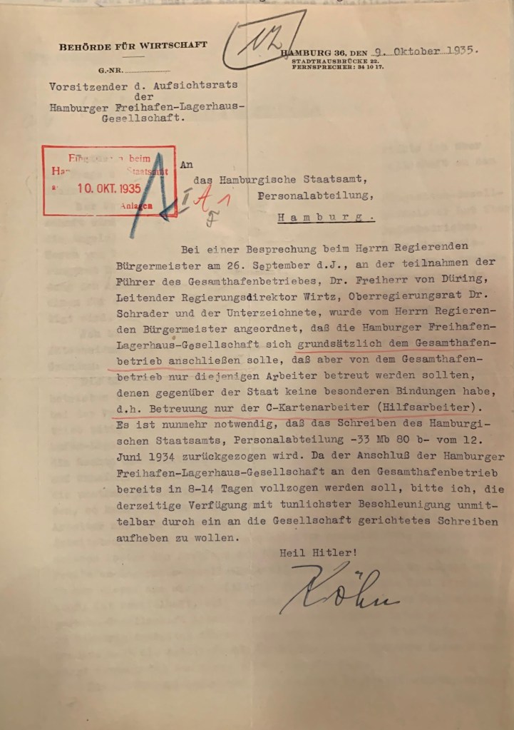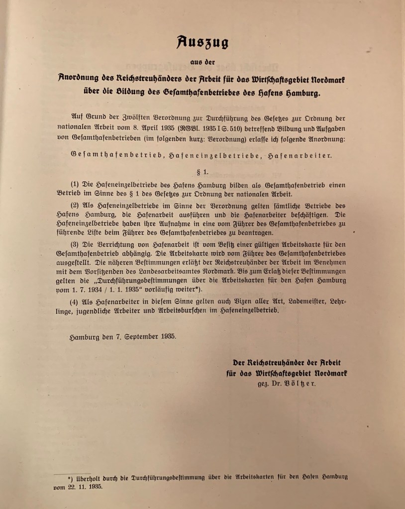 Das Reichsarbeitsministerium hatte 1935 ein Verordnung über die Bildung von Gesamthafenbetrieben erlassen. Der Begriff „Gesamthafen(Betrieb)“ entsprach der Auffassung der Nazis von der Unterordnung der Arbeiterinteressen unter die der Eigentümer (hier Hafenunternehmen). Die Bildung des Begriffs des „Gesamthafenbetrieb“‘bzw. des Unternehmen in Hamburg, der Gesamthafenbetriebsgesellschaft (GHBG), war einer zentraler Punkt in der Gestaltung der Arbeitsbeziehungen durch die Nazis. Inhaltlich hätten Beschäftigte und Unternehmen unter der Verantwortung der Betriebsführer gemeinsame Interessen. Ihre Einkommenslage und die Arbeitsbedingungen (Schichten, Urlaub) sei durch den Staat, den Treuhänder der Arbeit, geregelt. Ihre Rolle als Arbeiter wurde durch den Charakter der DAF unter Führung der NSDAP völkisch und rassistisch bestimmt. Hinzu kamen noch andere ideologische Werte, die die Nazis für sich bestimmt hatten. Mit Begriffen wie einem „Hafenkommissar“ wurde ideologisch das Bild der Organisierung der Prozesse und Beziehungen durch eien „Führer“-Personlichkeit.