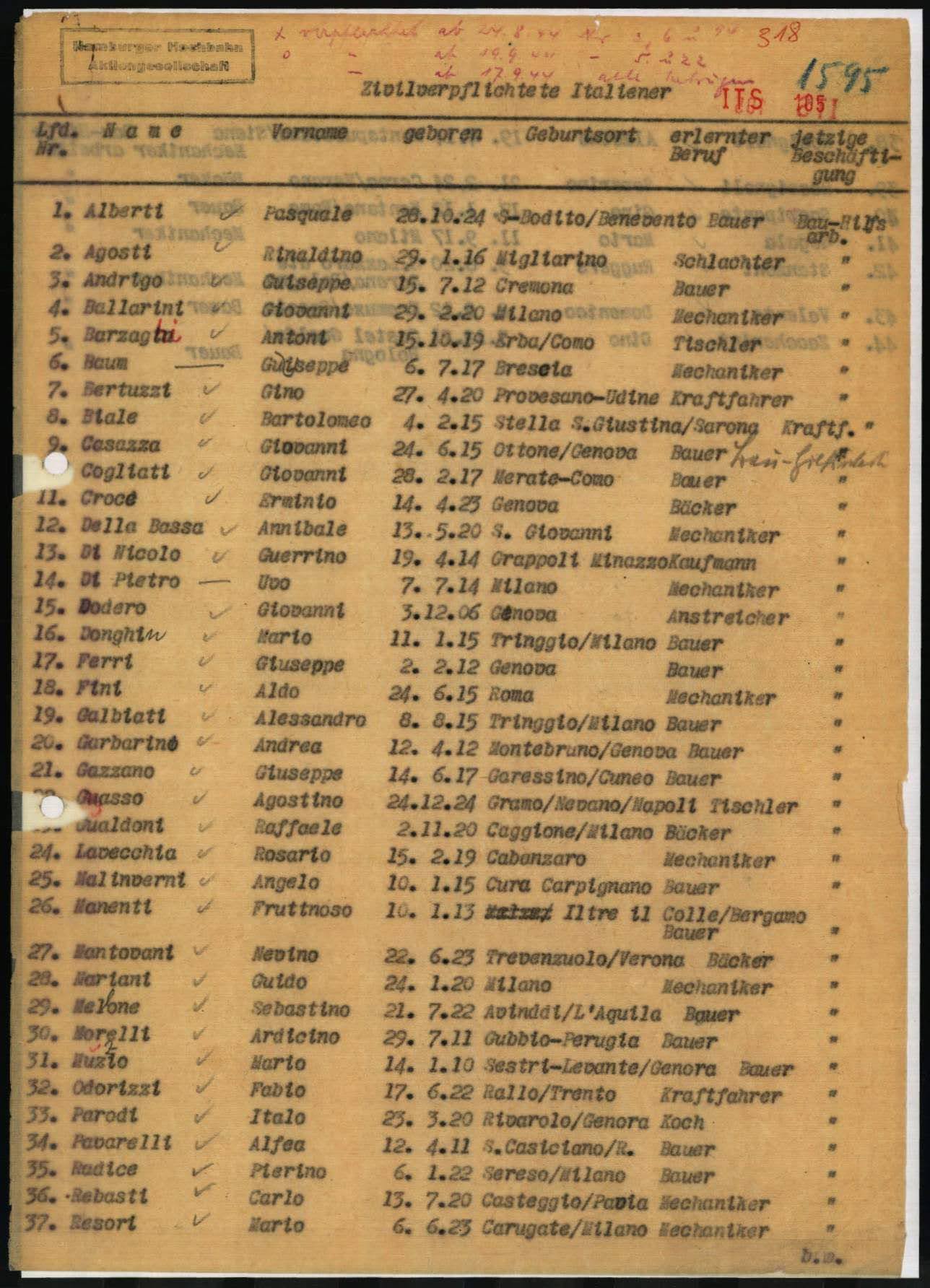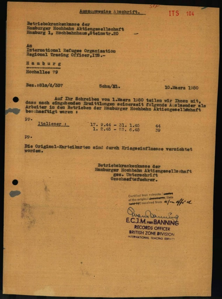 In einem Schreiben der Betriebskrankenkasse der Hamburger Hochbahn AG vm 10. März 1950 an die ITS, dass sie vom 17. September 1944 bis 31. Januar 1945 44, und vom 1. Februar 1945 bis 23. Juni 1945 49 italienische Militärinternierte bei sich eingesetzt hätten. Angeblich sein die “Orginal-Karteikarten” durch “Kriegseinflüsse vernichtet worden.”