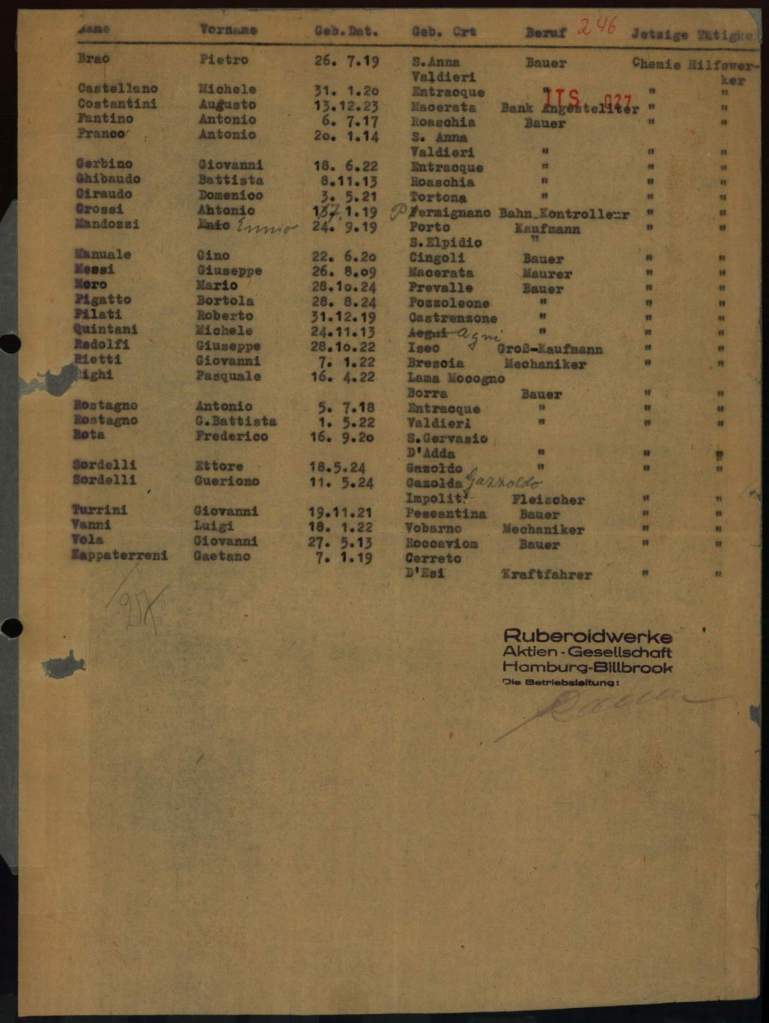 Im September 1944 meldete Ruberoid 27 italienische Militärinternierte an das Hamburger Arbeitsamt, die für sie arbeiteten. Hintergrund war, dass die IMIs seit September 1944 nicht mehr von der deutschen Wehrmacht überwacht wurden. Das Unternehmen musste jedoch melden, wenn sich die IMi ihrer Meinung nach „nicht ordnungsgemäß verhalten“. Das tägliche Leben verbesserte sich etwas, aber die Lebens- und Arbeitsbedingungen waren weiterhin schwierig. Obwohl sie als „freie Zivilarbeiter“ bezeichnet wurden, mussten sie ab 20 Uhr im Lager bleiben und konnten sich nicht mehr frei bewegen. Sie hatten keine finanziellen Mittel, aber es gab immer einen gewissen Schwarzmarkt mit französischen Zwangsarbeitern. In der Fabrik, in der sie ohne Begleitung herumlaufen konnten, da sie sichtbare Lichtbildausweise erhalten hatten, gab es Hochöfen, in denen Teerpapier hergestellt wurde, um die Dächer der zerbombten Häuser abzudecken.“In der Mittagspause, die etwa eine halbe Stunde dauerte, suchten wir Holz, um uns zu wärmen, und Kräuter zum Essen.“
