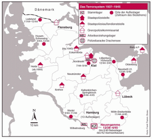 Das AEL Nordmark war im Juni 1944 am Kieler Stadtrand gebaut. Es bestand aus mehr als 20 Baracken. Es diente vor allem der Disziplinierung von Zwangsarbeiter, die in der Landwirtschaft und der Rüstungsindustrie arbeiteten mussten. Die Lagerinsassen kamen aus zahlreichen Nationen, den größten Anteil machten Sowjetbürger und Polen aus. Etwa ein Viertel waren Frauen. Der Lageralltag unterschied sich in nichts von einem Konzentrationslager, nur war die Einweisung ins AEL befristet. Die Häftlinge hatten täglich zehn Stunden härteste Arbeiten zu leisten, vor allem Aufräumarbeiten im Kieler Stadtgebiet. Unzulängliche Versorgung, miserable hygienische Bedingungen und unzureichende Krankenversorgung führten dazu, dass viele Häftlinge nicht überlebten. Misshandlungen und willkürliche Erschießungen waren an der Tagesordnung. Insgesamt waren etwa 5.000 Menschen im Lager inhaftiert, mindestens 578 überlebten die Lagerhaft nicht. Auch Kieler Firmen griffen gerne auf die billigen Arbeitskräfte zurück: so die Holsten-Brauerei, die Land- und See-Leichtbau GmbH, die Betonbaufirma Ohle & Lovisa und die Nordland Fisch-Fabrik in Hassee. Wer sich im Lager oder auf den Arbeitskommandos den Befehlen der Wachmannschaften widersetzte, erschöpft zusammenbrach oder anderweitig auffiel, wurde durch die SS willkürlich geschlagen, misshandelt oder sogar erschossen.
