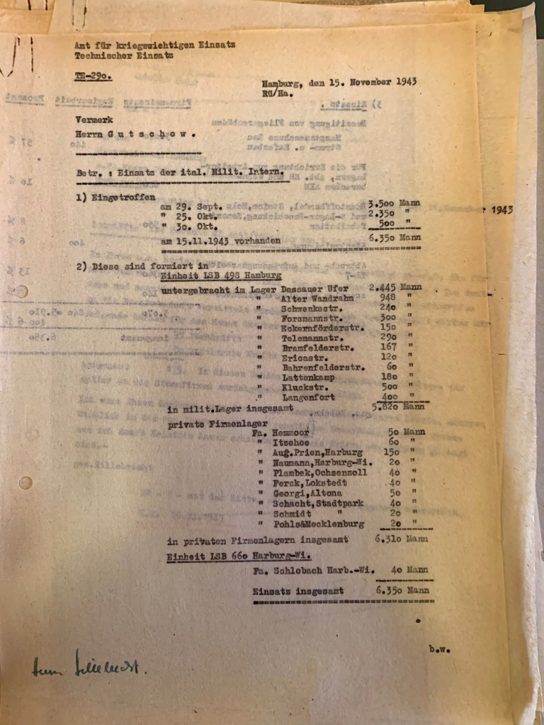 Von den ersten italienischen Militärinternierte, die ab Ende September 1943 vom Kriersgefangenen-Stammlager nach Hamburg kamen, wurden 150 gleich vom Harburger Bauunternehmen eingesetzt worden. Ab Herbst 1943 wurden im oberen Teil des Lagers am Falkenbergsweg In Neugraben etwa 500 IMIs untergebracht.