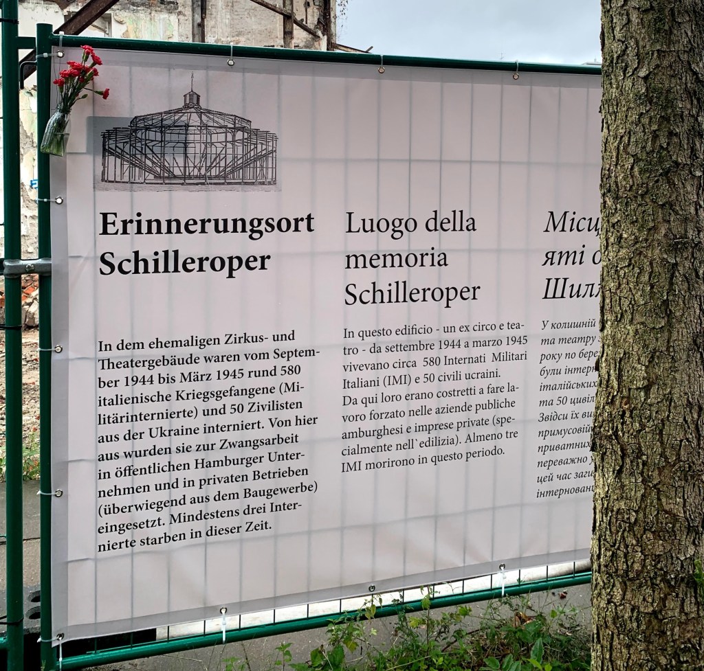 Alla fine del 1944, un totale di 590 IMI dovettero vivere nell’allora campo di lavoro forzato della Schilleroper. Il futuro della storica „Schilleroper“ è oggi incerto, ha detto Gudrun di cui è rimasta in piedi solo l’impalcatura della costruzione in acciaio. I proprietari vogliono demolirla. La società civile, le autorità culturali e l’Ufficio per la protezione dei monumenti storici sono a favore della conservazione. Durante la conversazione con Flavia Giona, la donna ha fatto riferimento alla targa che si trova sull’impalcatura e che ricorda i lavoratori forzati sovietici e italiani. Anche il nome di suo padre è riportato qui.