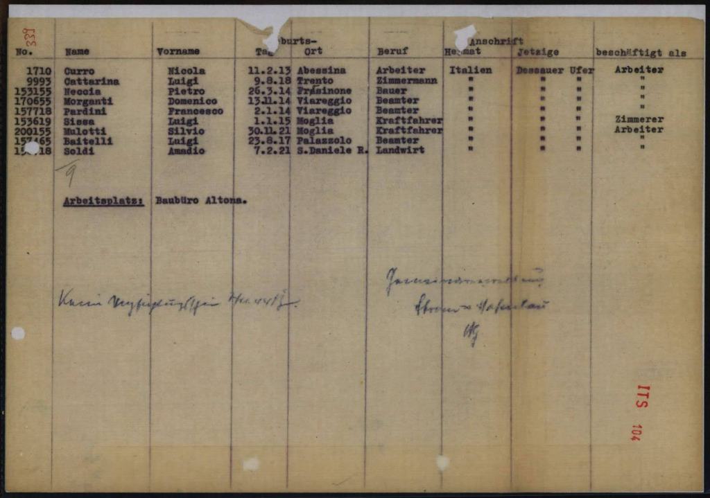 Über den Einsatz von italienischen Militärinterniert bei Strom- und Hafenbau gibt es mehrere Belege (wie auch Zwangsarbeiterinnen und Zwangsarbeiter aus anderen Ländern). So eine Mitteilung an das Arbeitsamt Hamburg, dass im August 1944 um die Namen der im Unternehmen im Einsatz befindlichen italienischen Militärinternierten gebeten hatte. Nach diesen Unterlagen setzte zum September 1944 die Behörde 118 italienische IMIs ein. Die IMI waren alle im Lagerhaus F am Dessauer Ufer untergebracht worden.