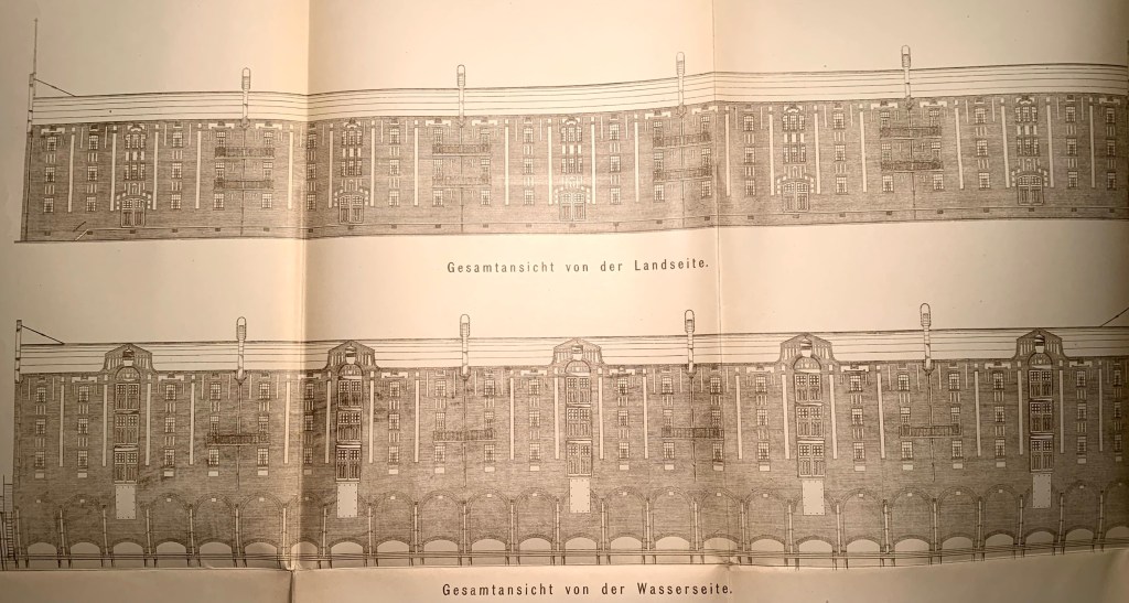 1903 baute die heutige HHLA, damals noch Hamburger Freihandel-Lagerhaus-Gesellschaft, drei gleichgroße Lagerhäuser F, G und H im Hamburger Freihafen am Dessauer Ufer.