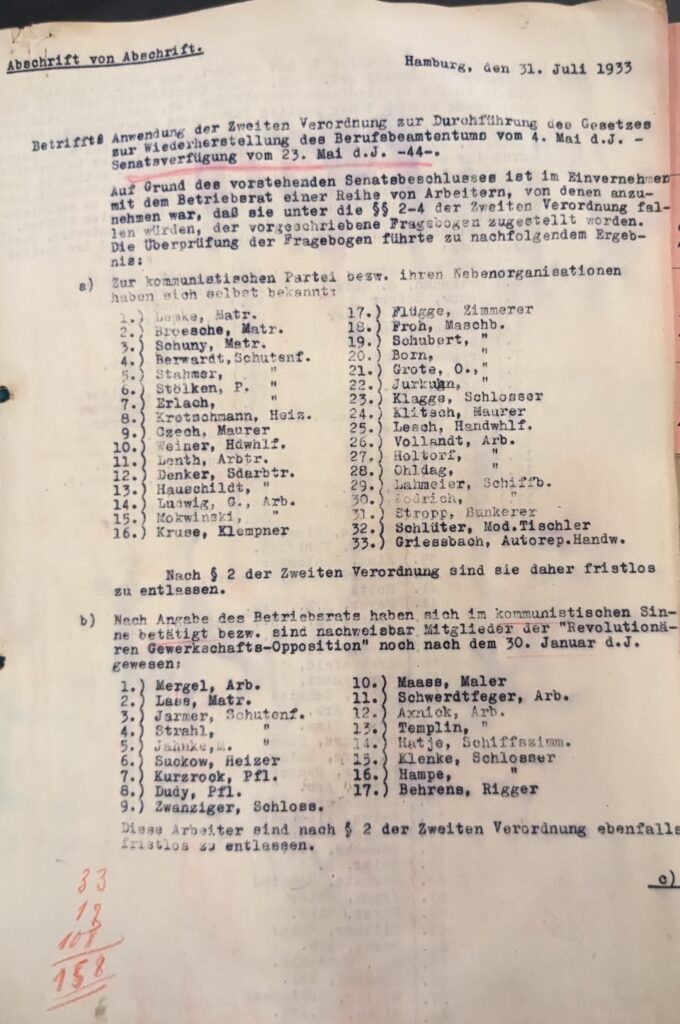 Non appena lo Stato prese il potere ad Amburgo nel 1933, 164 dipendenti della Strom- und Hafenbau furono licenziati dall’azienda sulla base della legge sulla presunta restaurazione del servizio civile professionale. La legge mirava a cacciare gli ebrei dal servizio civile, così come i membri del KPD, della SPD e i dissidenti.