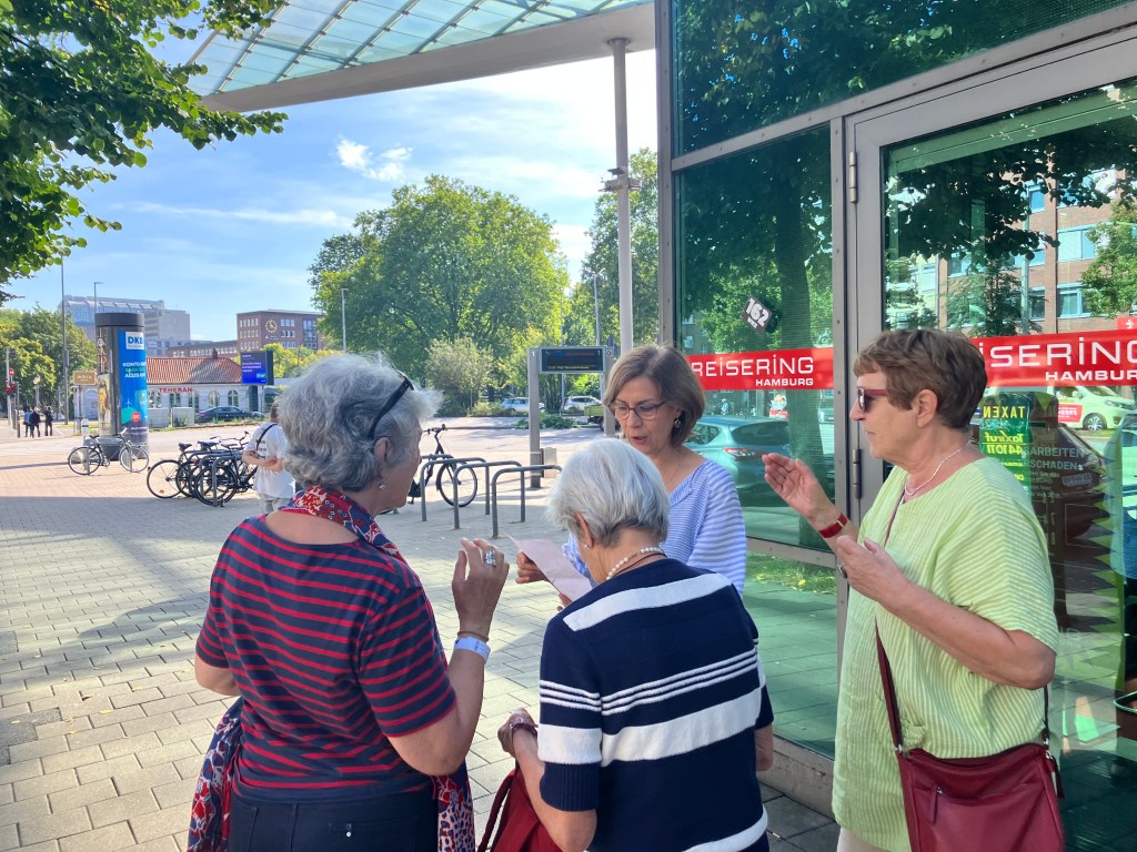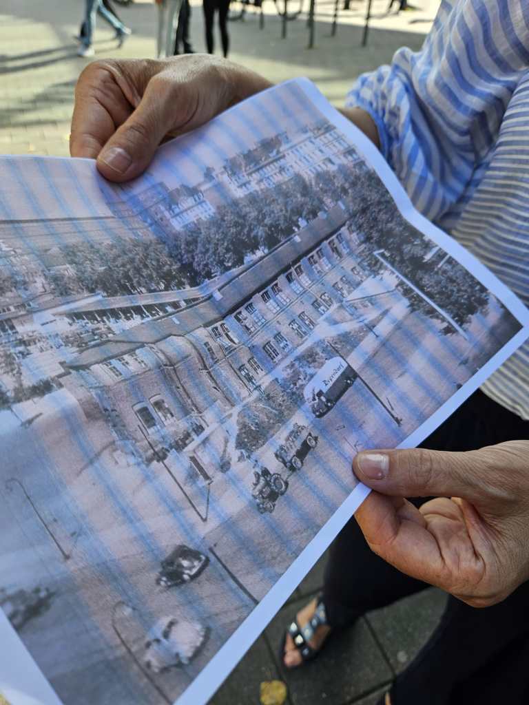 Karla Fischer (rechts im Bild) von der Geschichtswerkstatt St. Georg hatte ein Bild von der Jahnhalle nach 1945 mit dabei und erzählte, dass der große Turnzahl in einzelne Abschnitte eingeteilt war, in dem Menschen lebten. Mitte der 1950er Jahre wurde die Turnhalle abgerissen.
