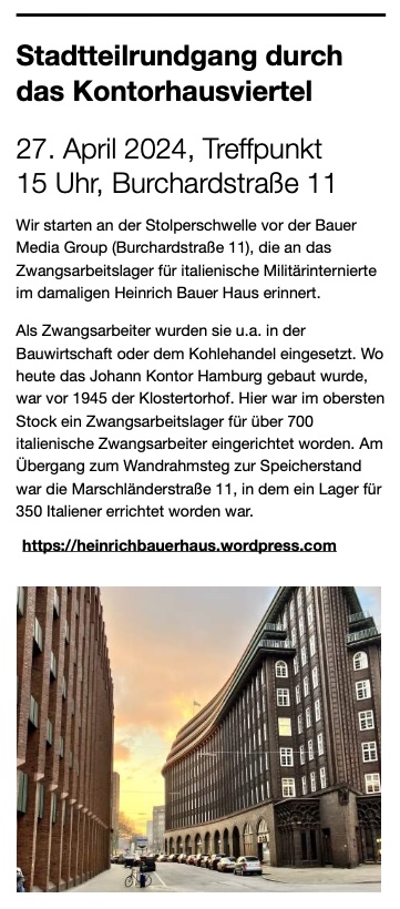 Si parte dalla pietra d’inciampo di fronte al Bauer Media Group (Burchardstraße 11), che ricorda il campo di lavoro forzato per gli internati militari italiani nell’ex Heinrich Bauer Haus.