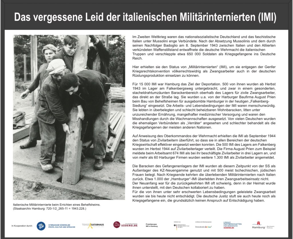 La stele è stata realizzata in collaborazione tra il Gymnasium Süderelbe (profilo culturale e linguistico), la Kulturhaus Süderelbe e il Gruppo di progetto Internati militari italiani di Amburgo.