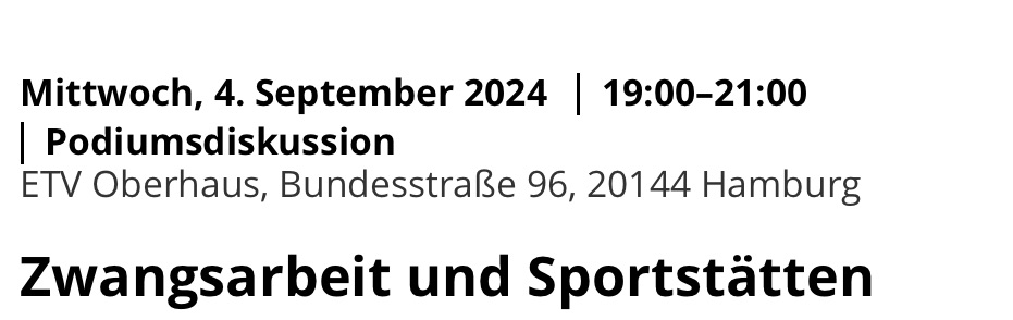 La serata si concentrerà sulle conoscenze esistenti sugli IMI negli impianti sportivi di Amburgo e in altri campi sportivi della città dove sono stati ospitati i lavoratori forzati. In che modo i rispettivi club sportivi affrontano oggi la loro eredità? Una discussione sulla responsabilità sociale nel calcio e sulle lacune nel lavoro di commemorazione.