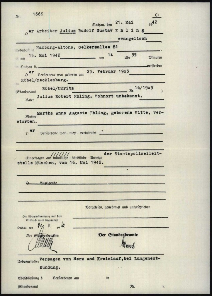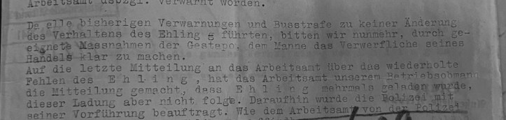 Wer von den deutschen Beschäftigten im Unternehmen nicht mit den Nazis ging, bekam es auch zu spüren. Sie wurden bei der Gestapo denunziert, bestraC und verfolgt. Einzelne wurden auch ins KZ verschleppt, nicht alle überlebten. Über einen Fall möchte ich Ihnen noch kurz etwas erzählen. Julius Ehling wohnte in der Georgstraße (heute Mumsenstraße am Wohlerspark). Er war seit 1938 bei Dolmar beschäftigt und hatte ein Handicap. Da er wiederholt nicht zur Arbeit erschien, wurde er vom Unternehmen am 26. April 1941 beim Arbeitsamt denunziert. Es forderte geeignete Maßnahmen der Gestapo gegen ihn.