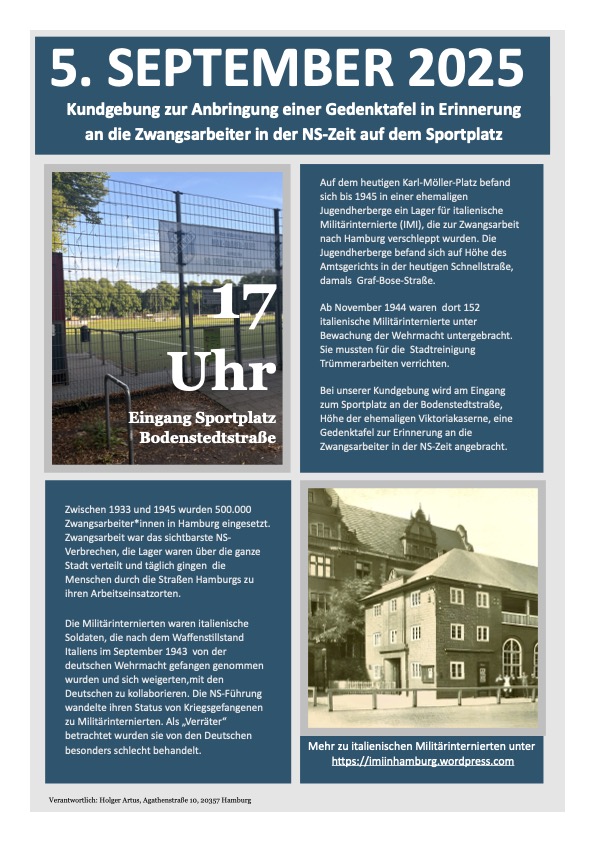 Am Sportplatz an der Max-Brauer-Allee wird künftig eine Gedenktafel an die 152 italienischen Militärinternierten (IMI) erinnern, die von Oktober 1943 bis April 1945 als Zwangsarbeiter in einem Lager in der dortigen Jugendherberge untergebracht waren. Sie wurden vor allem für Trümmerarbeiten eingesetzt. Diese Arbeiten wurden von der damaligen Stadtreinigung an Hamburger Baufirmen vergeben, die ihrerseits IMI einsetzten.