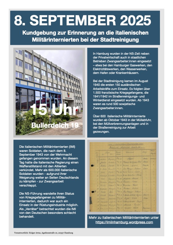Am 8. September 2025 wird vor dem Hauptgebäude der Stadtreinigung am Bullerdeich 19 mit einer Kundgebung an all die Menschen erinnert, die in der NS-Zeit von 1940 bis 1945 als Zwangsarbeiter:innen für die Stadtreinigung Hamburg eingesetzt wurden. Vertreter:innen der Stadtreinigung, aus Italien und Frankreich sowie aus der Zivilgesellschaft werden bei der Veranstaltung sprechen. Im Anschluss an die Kundgebung wird eine Gedenktafel der Öffentlichkeit übergeben.