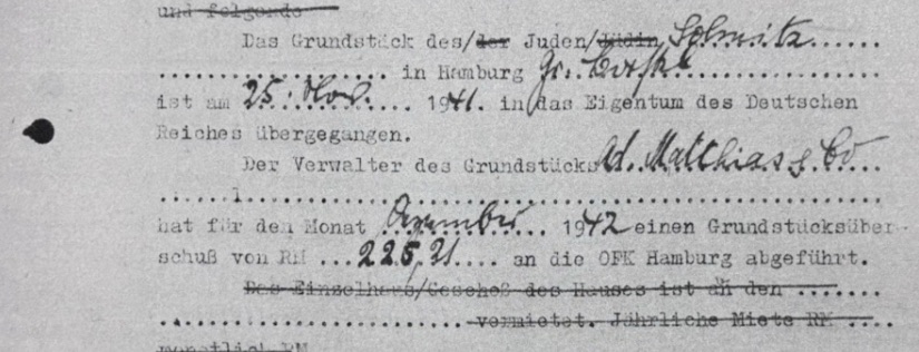 Nach der Emigration der Solmitz wurde am 25. November 1941 das Grundstück in das Eigentum des Deutschen Reiches „überführt“ und damit den Familien geraubt. Auch gegenüber den Blumenfeld und Plauts verfuhr man so, obwohl das selbst nach NS-Gesetz nicht möglich war, da sie amerikanische Staatsbürger waren.