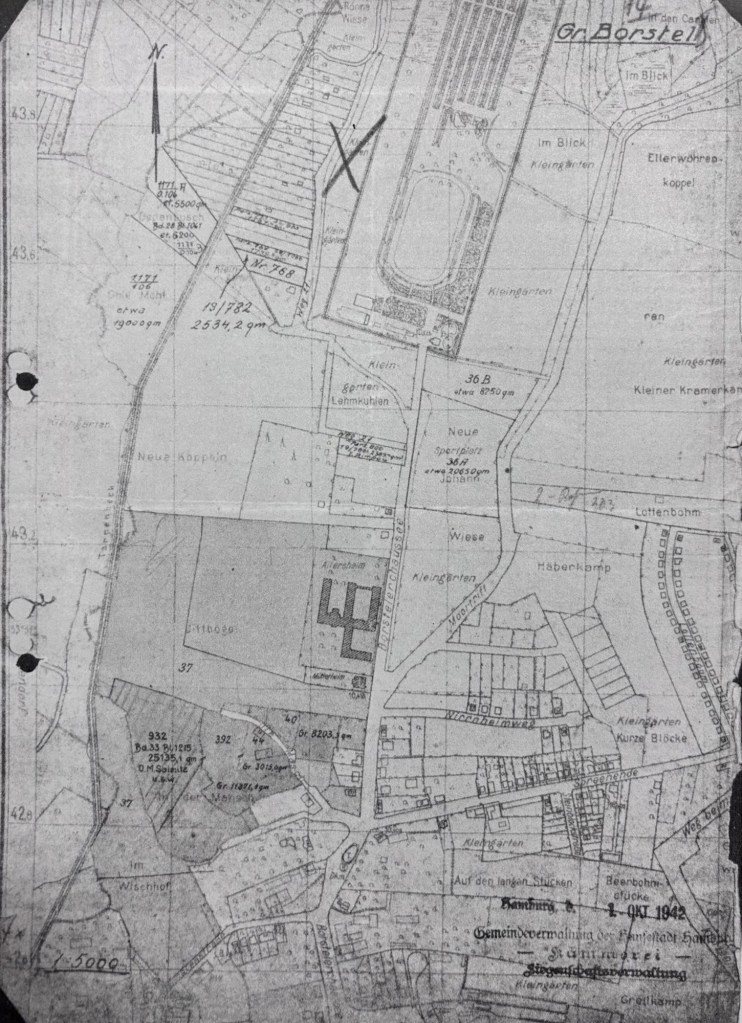 Im August 1943 kaufte die Stadt Hamburg das Grundstück. Die Gebäude darauf waren 1942 und 1943 zerstört worden, 41.000 qm wurden verpachtet.