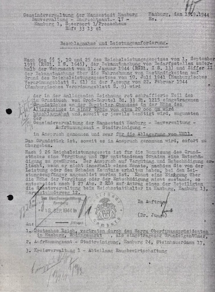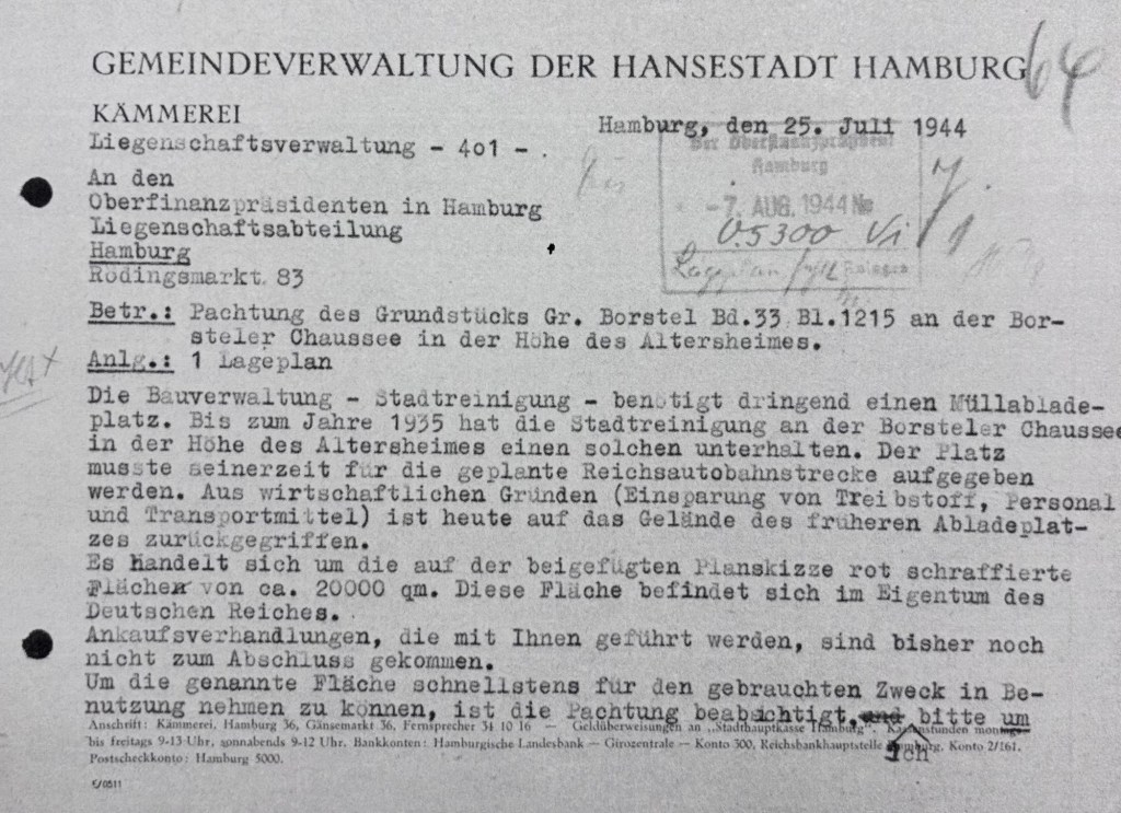 Die damalige Stadtreinigung in der Hamburger Bauverwaltung sorgte 1944 dafür, dass ihr ein einer jüdischen Familie geraubtes Grundstück als Müllabladeplatz überlassen wurde.