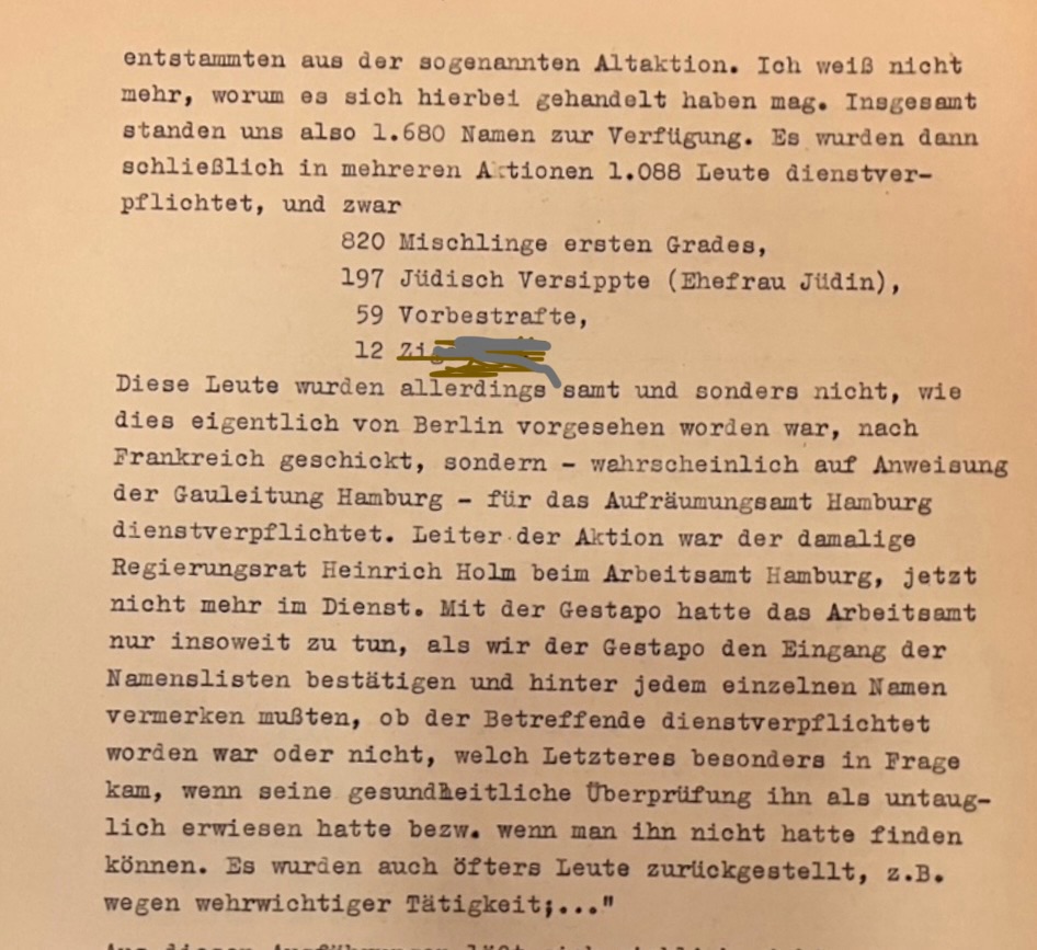 Im Frühjahr 1944 begann die Gestapo, sich vom Arbeitsamt Hamburg, 1680 Namen von in Hamburg arbeiten Juden und Sint*zze zu besorgen und auszuwerten, um sie zur Zwangsarbeit einzusetzen. Das bedeutete, dass sie aus ihrer damaligen Beschäftigung entlassen wurden und im Auftrag des Aufräumungsamt einzusetzen. Insgesamt betraf das 1.080 Verfolgte, darunter 12 Sinti*zze.