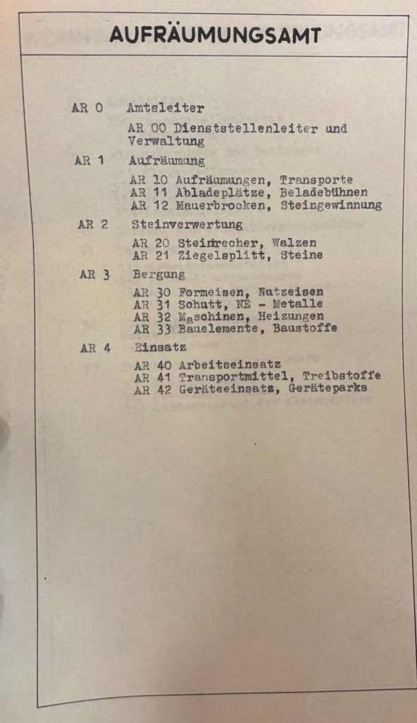 Zum Zeitpunkt der Gründung des neuen Amtes gehörte die Stadtreinigung noch nicht dazu. Es ging um „Aufräumen“, „Steinverwertung“ und „Bergung“ sowie die Resourcenplanung „Einsatz“.