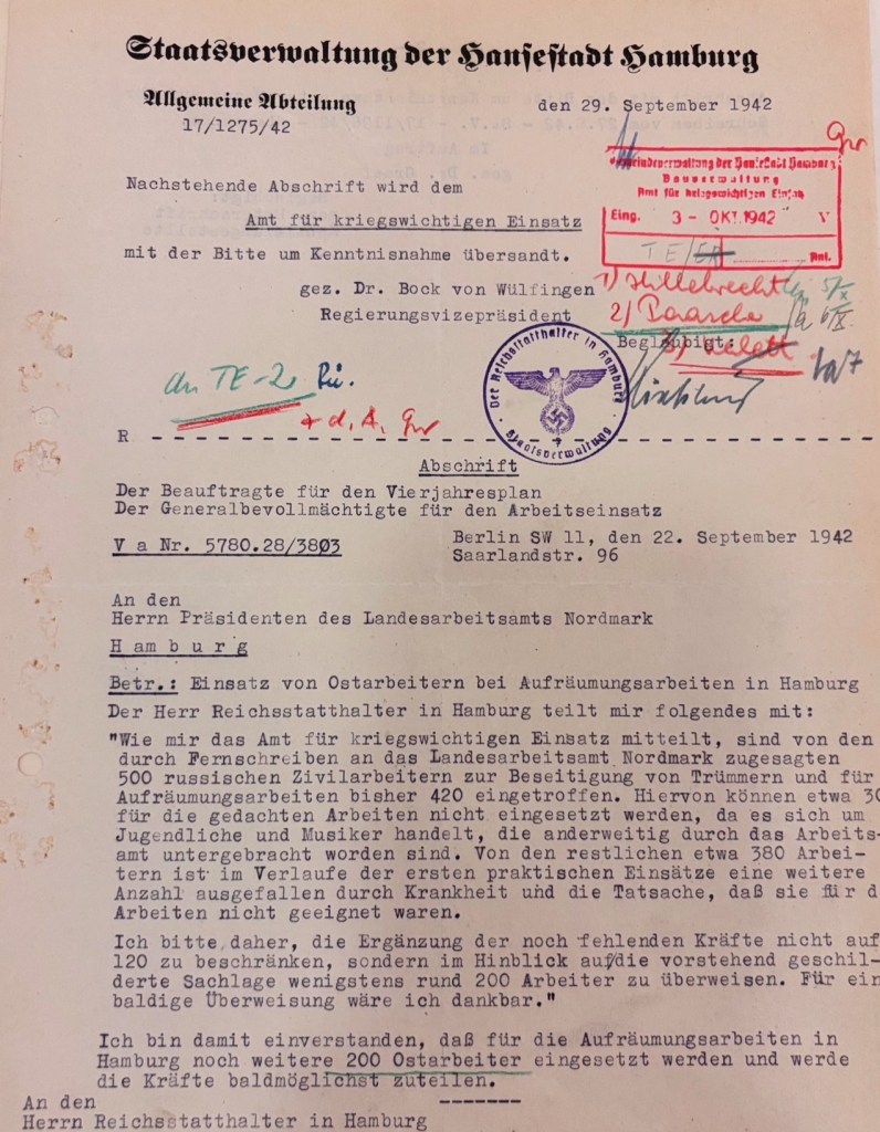 Die „Vermittlung“ der Zwangsarbeiter:innen wurde in der NS-Zeit bis auf die KZ-Insassen über das Arbeitsamt organisiert. Leider sind dessen Unterlagen im Hamburger Staatsarchiv nicht einsehbar und nicht erschlossen. Auf einer Arbeitsamtbesprechung im Uhlenhorster Fährhaus vom 21. Juli 1942 wurde auf den Beschränkungen des Arbeitseinsatzes sowjetischer Menschen zu dem damaligen Zeitpunkt hingewiesen, dass sie nur zur Beseitigung von „Angriffsschäden“ eingesetzt werden durften.