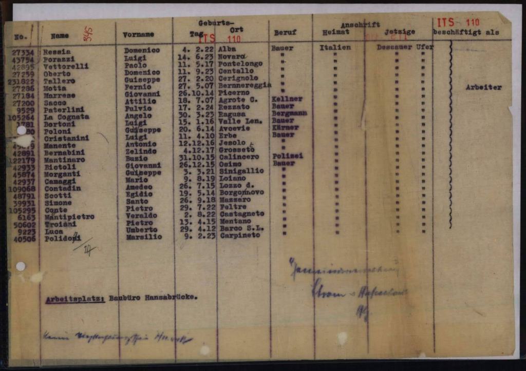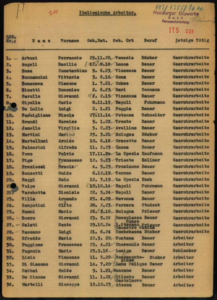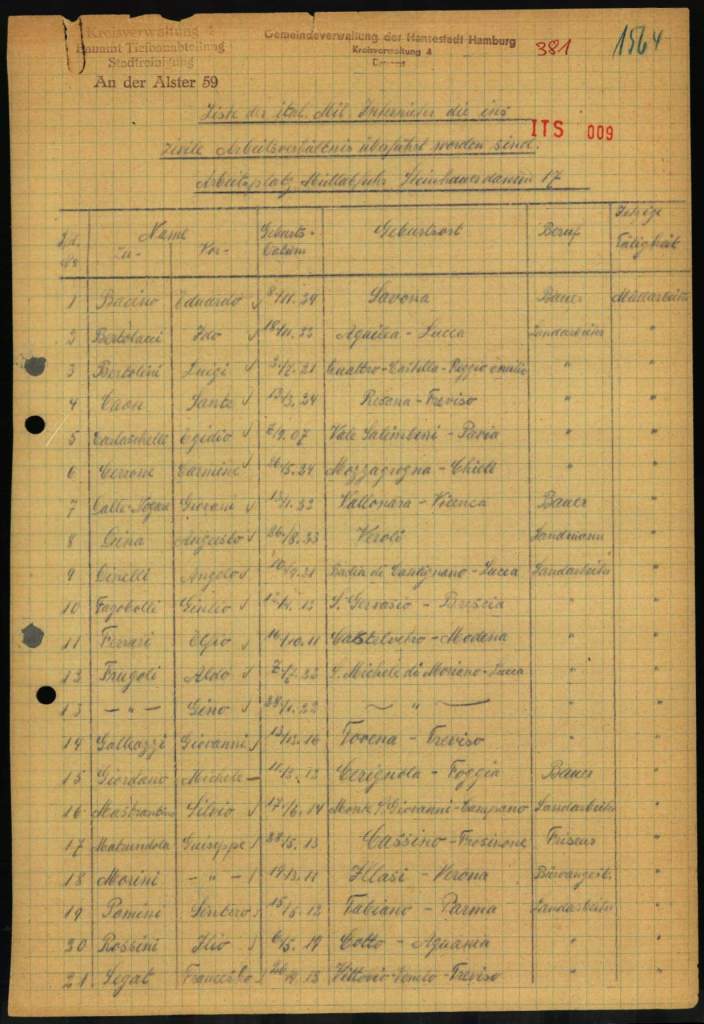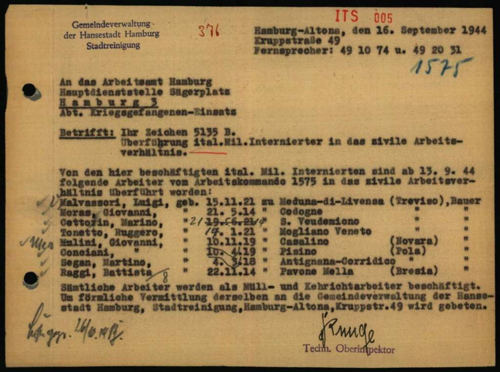 Ende September 1943/Anfang Oktober 1943 kamen tausenden italienische Militärinternierte nach Hamburg, um als Zwangsarbeiter unter der Bewachung der Wehrmacht hier zu arbeiten. Sie wurden so genannten Arbeitskommandos zu geteilt und lebten in Zwangsarbeitslager auf die Stadt verteilt. Neben den privaten Unternehmen haben auch Einrichtungen der Stadt sie angefordert. Das galt in erster Linie für die Versorgungsbetriebe von den Hamburger Gaswerken, den Hamburger Elektrizitätswerken, den Hamburger Wasserwerken, der Hamburger Hochbahn, Strom- und Hafenbau, der Stadtentwässerung oder der Stadtreinigung, aber auch im Gesundheitswesen. Insgesamt waren bis zur Befreiung über 17.000 italienische Militärinternierte in Hamburg.