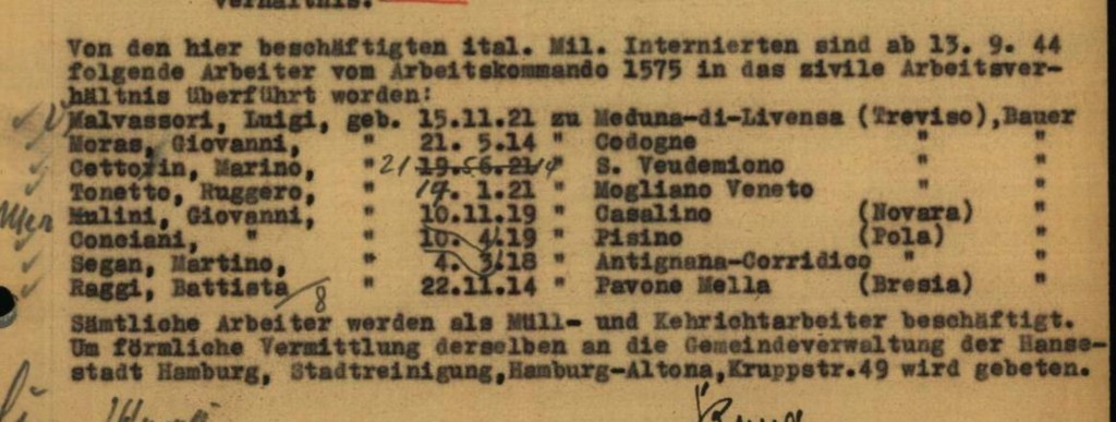 In Hamburg waren zwischen September/Oktober 1943 und Mai 1945 insgesamt 649 italienische Militärinternierte bei der Stadtreinigung im Einsatz. Zum Vergleich: 1939 umfasste die Belegschaft der Stadtreinigung etwa 1.500 Beschäftigte – 450 in der Müllabfuhr, 780 in der Straßenreinigung, 200 in den Müllverbrennungsanlagen und 80 im Fuhrpark.