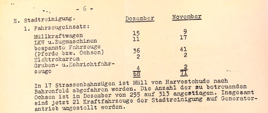 Als Ersatz wurden zunehmend „bespannte“ Wagen mit Pferden und Ochsen eingesetzt. Das Berichtswesen über den Fuhrpark der Stadtreinigung passte sich dieser Entwicklung an: Regelmäßig wurde über die steigende Zahl eingesetzter Zugtiere informiert. Im Dezember 1944 meldeten die Verantwortlichen, dass die Zahl der eingesetzten Ochsen auf 313 erhöht worden sei.