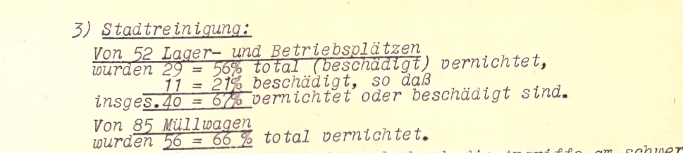 In einem Bericht der Baubehörde vom August 1943 heißt es: „Die Stadtreinigung ist demnach durch die Angriffe am schwersten in Mitleidenschaft gezogen worden. Die Schwierigkeiten zeigten sich besonders bei der Müllabfuhr, die insbesondere auch wegen des katastrophalen Personalmangels nicht in der Lage ist, den […] anfallenden Müll ausreichend zu beseitigen.“