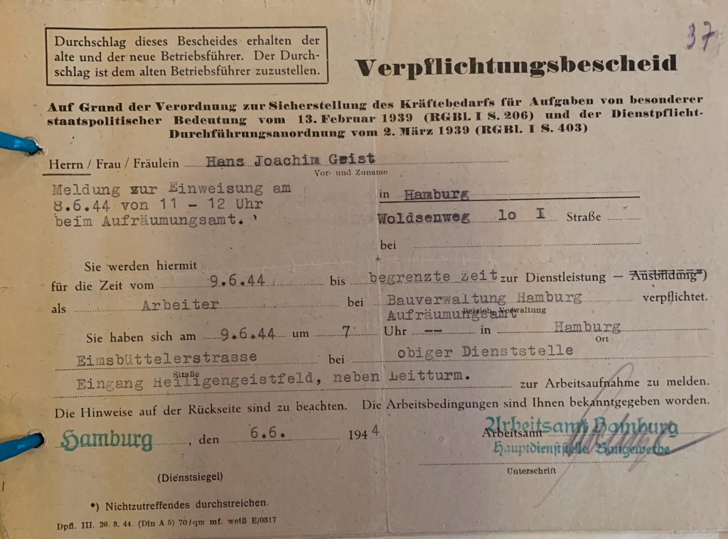 Die Organisierung der Zwangsarbeit über das Aufräumungsamt erfolgte über deren Standorte in den zuständigen Kreisen. Im Fall von Hans-Jaochim Geist, dessen Mutter Jüdin war und er deswegen als Zwangsarbeiter verpflichtet wurde, war es der Kreis Altona. Das „zuständige“ Aufräumungsamt saß damals in der Sternstraße 5 (heute Hospitalstraße). Eine weitere Sammelstelle des Aufräumungsamt befand sich z.B. in der (Schule) Wendenstraße 268 oder dem Steinhauerdamm 17. Von den Standorten der Kreisaufräumungsämter ging es zu den jeweiligen Arbeitskommandos.