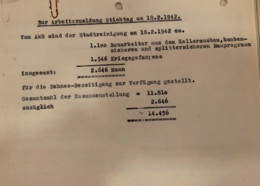 Bei der Stadtreinigung waren insgesamt 649 IMI an den verschiedenen Standorten des Unternehmens tätig. Die 54 hier in der Jarrestadt 66 kamen jeden Tag aus ihrem Barackenlager in der Trabrennbahn Farmsen. Das Zwangsarbeitslager der französischen Kriegsgefangenen – für die Straßenreinigung – war im Winterhuder Fährhaus.